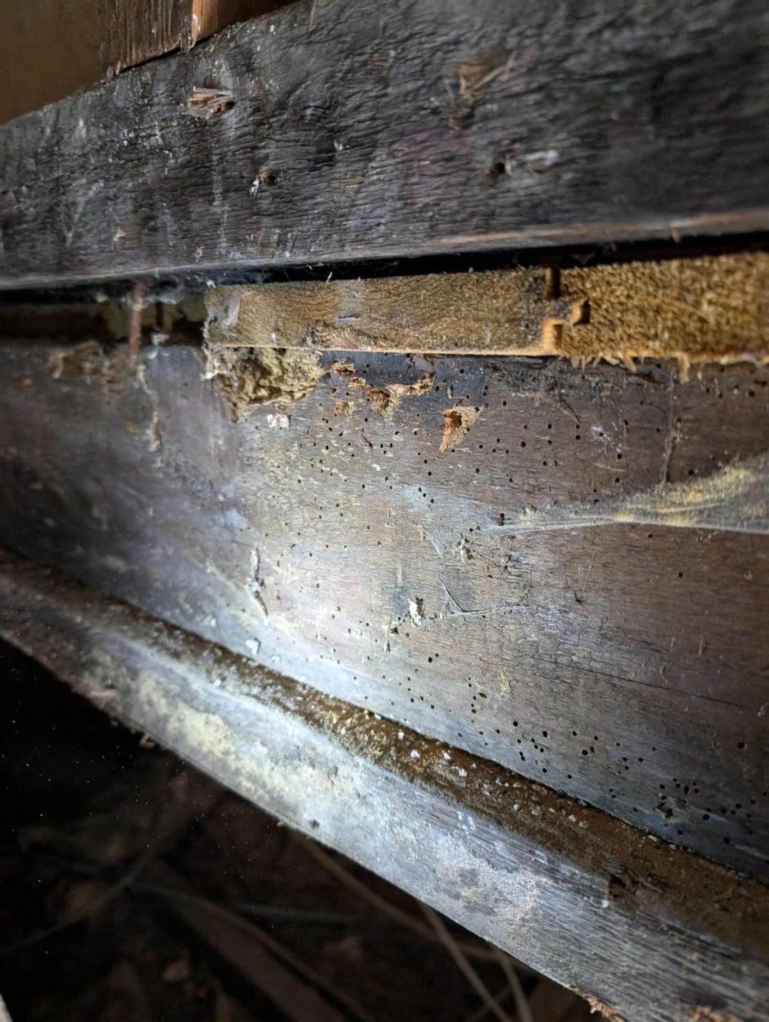 This image shows a severe active woodworm infestation (the common furniture beetle known as Anobium Punctatum), which we discovered on a pre-purchase inspection in Cockermouth.